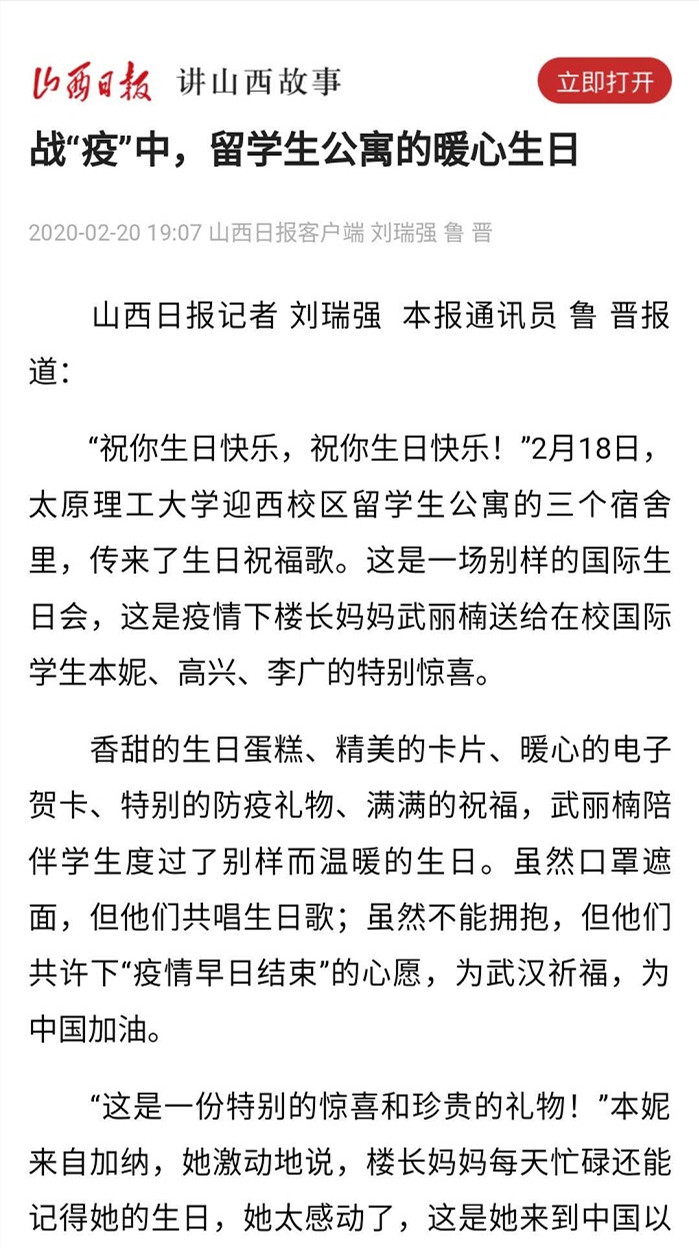 “248名国际学生在楼里,我不放心,跟他们待在一起,我就安心了。特殊时期,这群学生是学校最牵挂的,我跟我的同事们更要齐心协力守护好他们。”武丽楠说:“给孩子们过个简单的生日,只是想让他们开心一点,增强抗‘疫’的信心。”