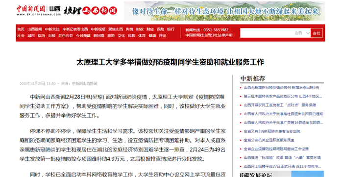 停课不停助不停学,保障学生生活和学习需求。该校密切关注受疫情影响严重的学生家庭和防疫期间家庭经济困难学生的学习、生活,设立疫情防控专项困难补助。对本人或直系亲属患新冠肺炎的学生和现居住在湖北的家庭经济特别困难学生逐一排查,2月24日为49名学生发放第一批疫情防控专项困难补助4.9万元,之后根据排查情况进行分批发放。