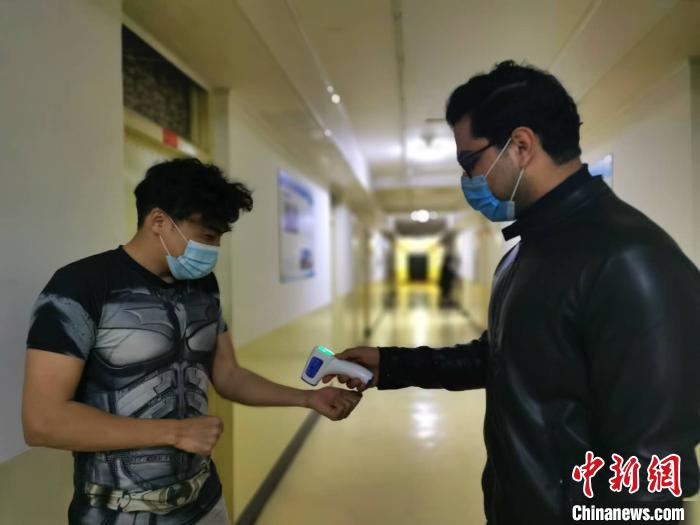 为保障国际学生正常生活与学习,学校除采购食材和生活用品外,每日为他们检测体温、配发口罩,学生辅导员还不定期走访宿舍、疏导学生情绪。