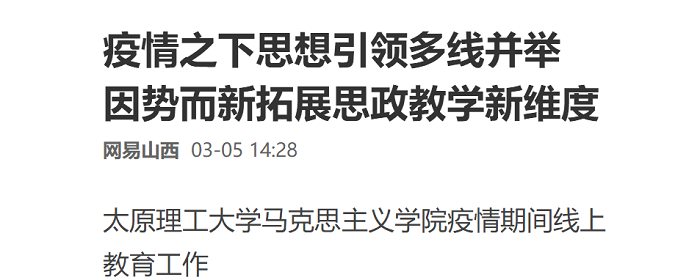 学院还向全校学生发出倡议,要把思政课程的教学效果写在抗击“疫情”的最前线,鼓励和引导学生在实践中认识和思考思政教学重点问题,在现实中思考重大理论问题。通过集中备课方式,组织全体思政课教师进行疫情期间国情、社情和民情专题教学分享。针对学生思想中存在的倾向性问题,及时在教学活动中进行疏导,有力推动了全校学生以更为饱满和积极的心态投入到教学和实践活动中去,为学生工作的平稳运行做出了突出贡献,为共同战胜疫情树立了信心,增添了力量。(网易山西 张丽 闫珊)